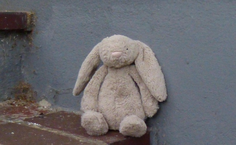 Auf den Hackeschen Höfen, an einer Kellertreppe im Hof IV saß er. Es war staubig und die Sonne schien den Staub von Minute zu Minute noch feiner zu pulverisieren. Wie ist er dort hingelangt? Er schweigt darüber und so sind wir im Moment auf Vermutungen angewiesen. Ist er aus einer Kinderhand gefallen, die beim Einschlafen in der Hitze den festen Griff um seinen Hals geöffnet hat? Oder ist er selbst geflüchtet? Ist er ein Flüchtling, ein Vagabund?
